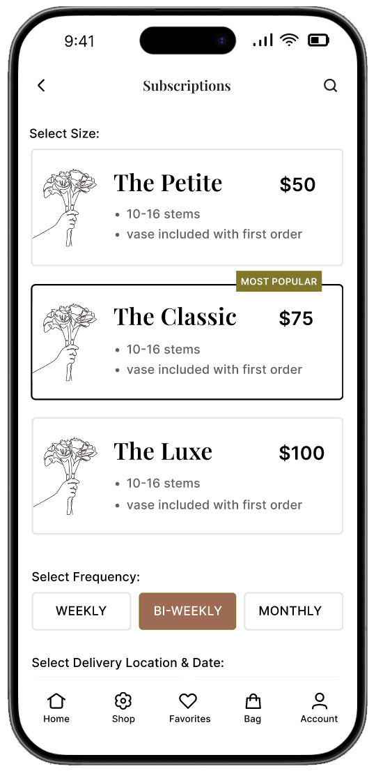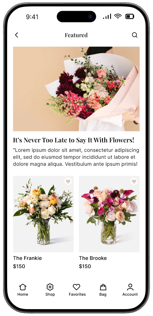 In designing this flower delivery app, I intend to represent a forward-thinking approach to floral services, meeting the needs of modern consumers through a blend of convenience, affordability, and premium quality. By providing accessible solutions for users unable to visit local florists, the app ensures that high-end, contemporary bouquets are within reach for everyone, regardless of their location.